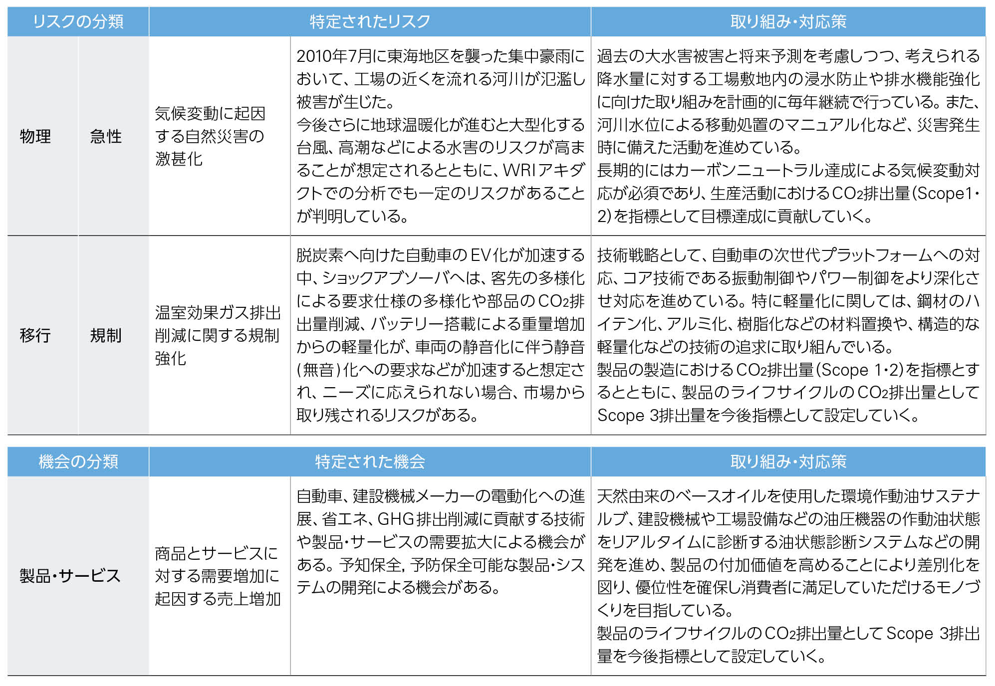 さらに、下表に示すシナリオ分析を通じて影響度を評価し、その結果を事業戦略や経営計画に反映させています。