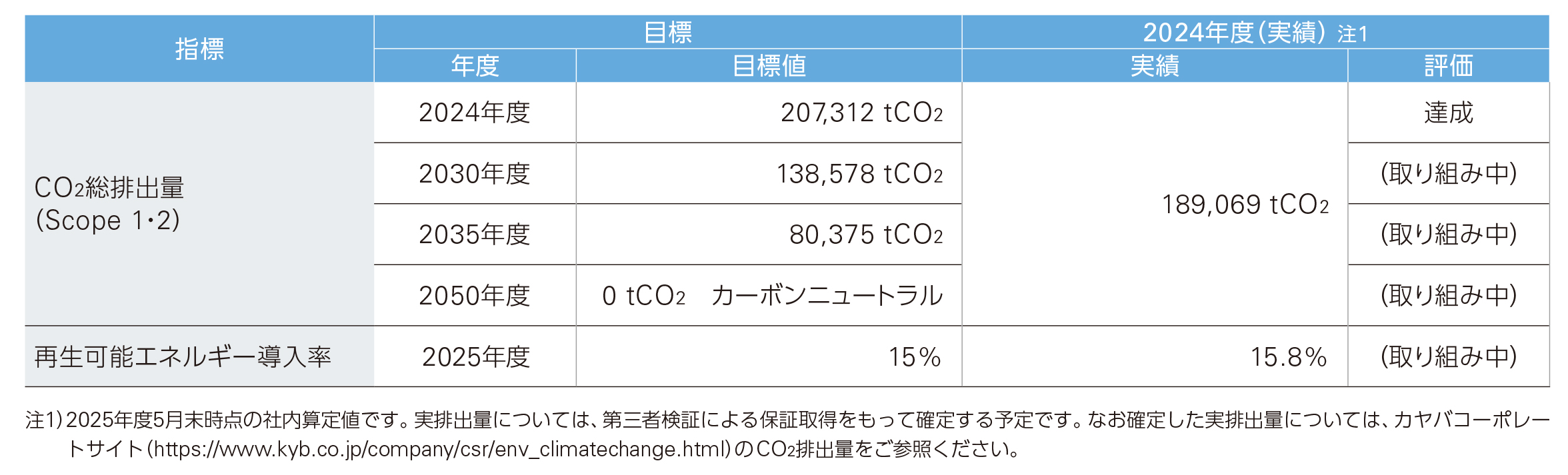 カヤバおよび連結子会社の生産拠点において、気候変動に関する指標の目標および実績は、次のとおりです。