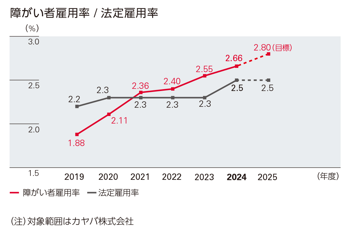 障がい者の担当業務領域の拡充と受け入れ職場の拡大などにより、障がい者雇用率の向上と、障がい者と健常者がともに働きがいを感じられる職場環境の実現に向けた活動を進めています。カヤバでは2019年9月に「業務支援センター」を設置し、社内の各部門、官公庁、学校、各種団体と連携して雇用促進や定着率の安定に向けた取り組みを進めてきた結果、2019年3月末に1.88%であった障がい者雇用率が、2025年3月末現在では2.66%となり、2024年4月より引き上げられた法定雇用率2.50%を上回る雇用率となっています。引き続き、障がい者雇用を推進していきます。