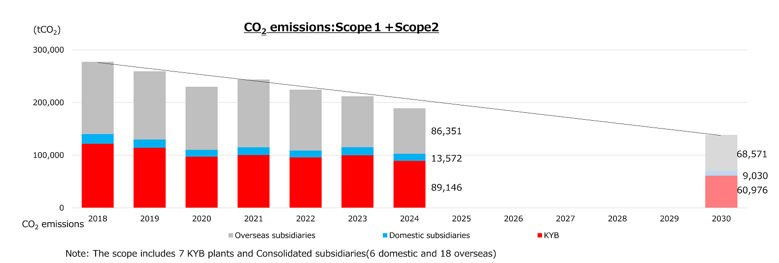 KYB has declared its commitment to achieving carbon neutrality by FY2050. To reach this goal, we are promoting initiatives across all business activities that focus on reducing energy consumption (energy conservation), expanding the use of renewable energy, and preparing for the future introduction of innovative technologies.