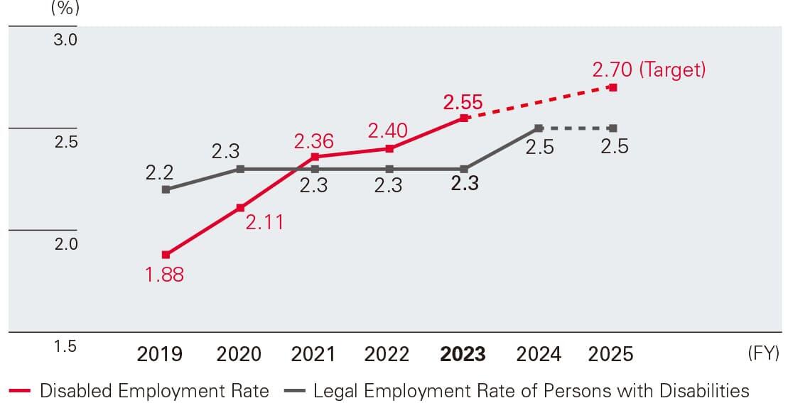 We are progressing with initiatives aimed at the creation of a workplace where people with disabilities and those without disabilities can work and enjoy job satisfaction. We are widening the scope of the work that people with disabilities conduct as well as increasing the workplaces they can enter, thereby raising the hiring rate of people with disabilities. In September 2019, KYB established the Work Support Center, which conducts activities aimed at promoting employment and increasing the retention rate in cooperation with each department within the Company, government offices, schools, and various associations. At the end of March 2019, the disabled employment rate was 1.88%, and it has risen to 2.55% as of the end of March 2024. This surpasses the legal employment rate of 2.50%, which came into effect on April 1, 2024. Going forward, we will continue our efforts to hire people with disabilities.