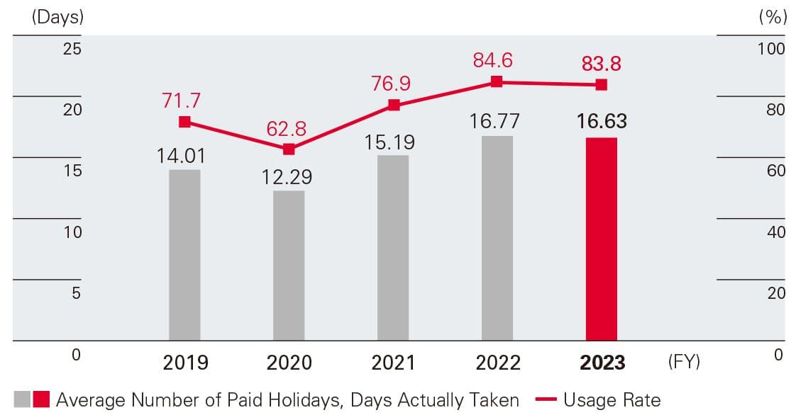 In order to prepare an environment in which employees can work with peace of mind and to support work-life balance, we have introduced a remote work system, flexible-hours system, childcare / care giver temporary leave, reduced working hour system, and a spouse transfer leave system. Through these systems, we promote diverse working styles, increase productivity through business rationalization, and avoid long working hours through promoting the taking of annual paid vacation, thereby increasing employee engagement. Regarding the childcare system in particular, we aim to inform Company members about our systems related to childbirth and childcare by providing a guidebook for childbirth and child raising for female employees, male employees, and the management. Also, we have set up consultation desks at each worksite. Through these efforts, we are working to promote the active participation of male employees in childcare.