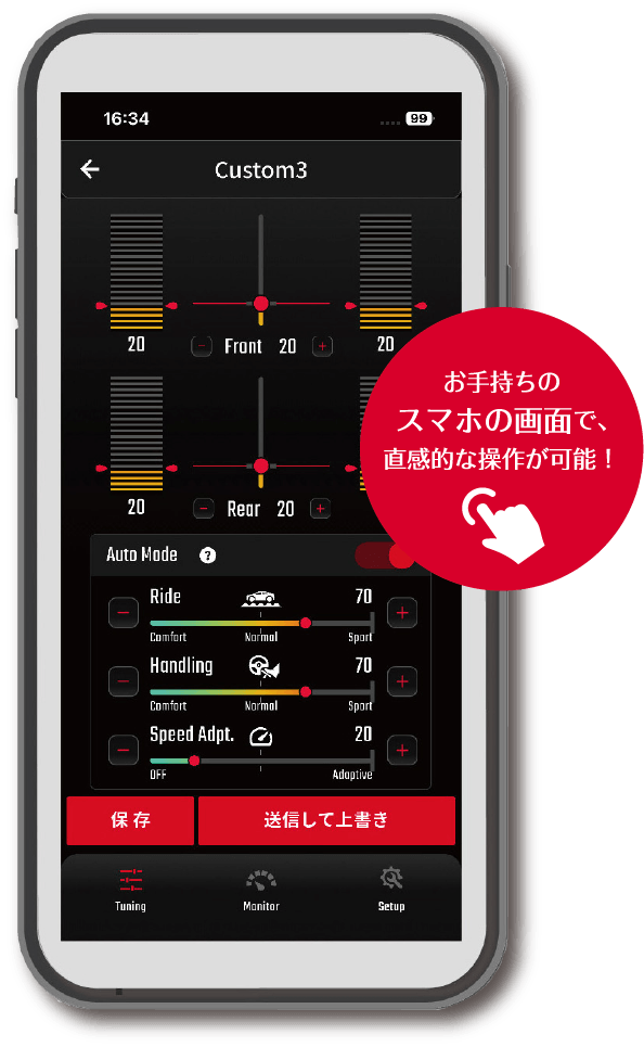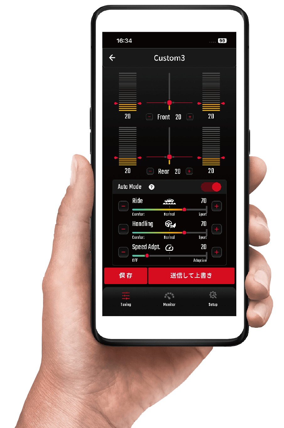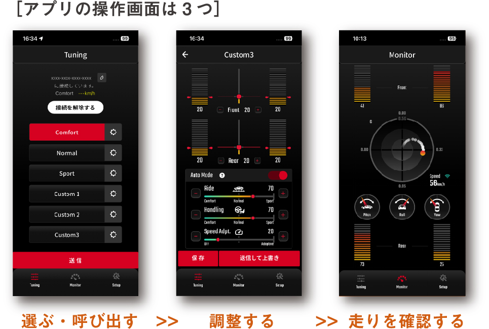 カスタム画面では、スマホで聞く音楽をその日の気分に応じてセレクトするように、フロントとリアのベースダンピングの段数をアプリ上のバーを上下に動かして設定したり、「乗り心地」や「操縦安定性」を、バーを左右に動かして調整できます。また、モニター画面では、カスタマイズした車両挙動をリアルタイムで可視化できます。いずれもスマホアプリ上なので、見やすさも使いやすさも抜群。より直感的に、楽しく操作できます。
