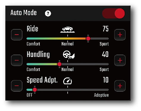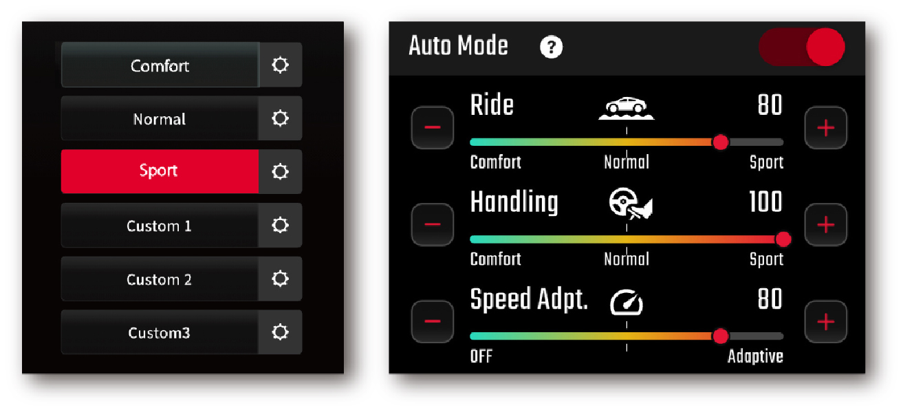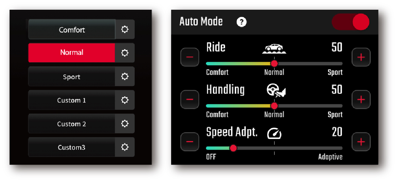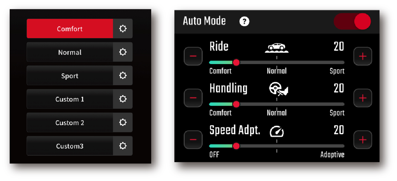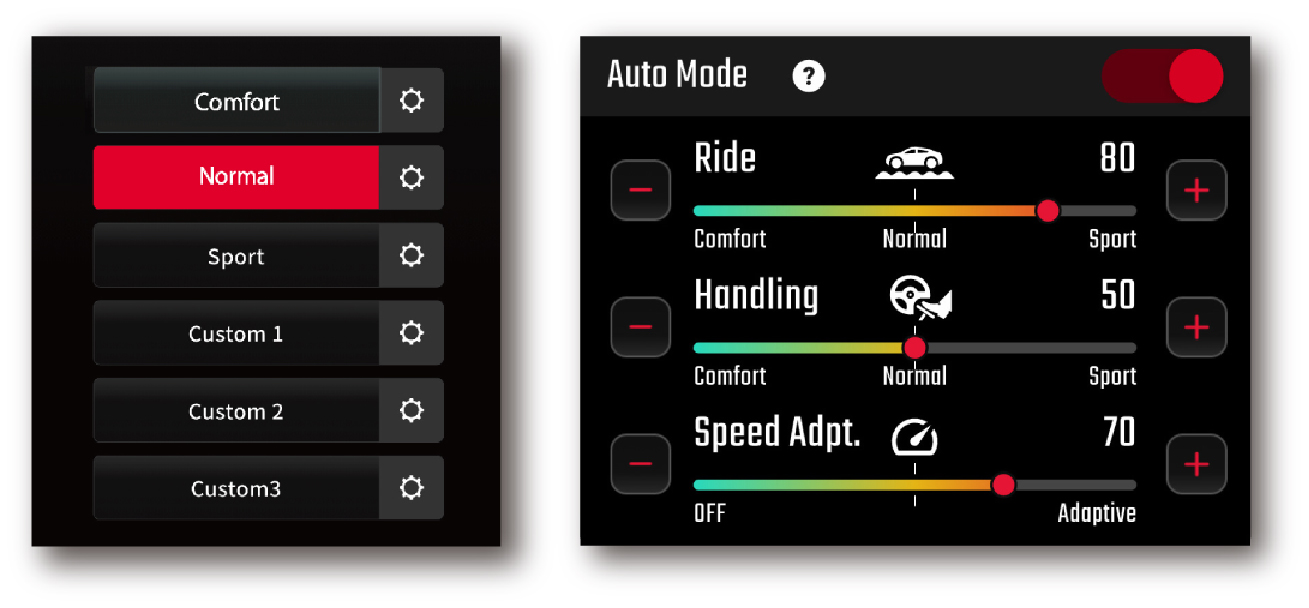 「ライド(乗り心地制御)」「ハンドリング(操縦性制御)」「スピードアダプト(車速連携)」それぞれ100段階で好みの制御にアレンジできます。