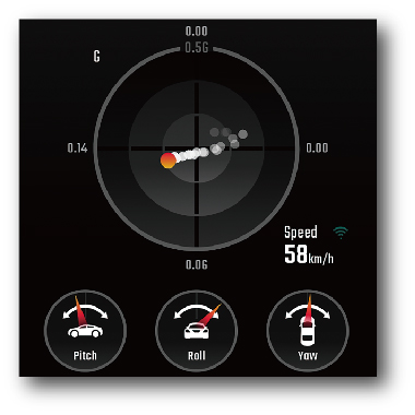 採用した6軸IMUセンサによって、車両の変化をリアルタイムに可視化。車の挙動にGボールやジャイロメータなどが反応します。