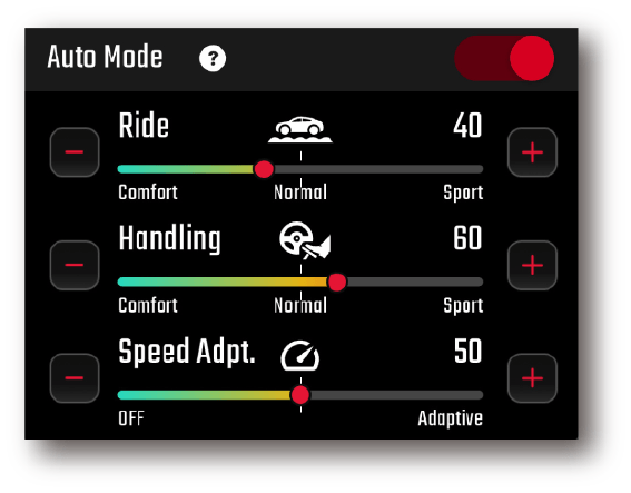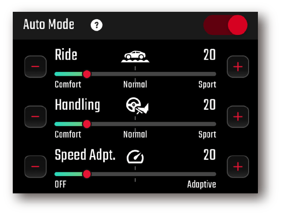 オートモードを「オン」にした場合、コントローラに搭載されたセンサによって車の動きを緻密に捉えて、リアルタイムに減衰指令を制御します。ベースダンピングの調整に加えて、Ride・Handling・Speed Adpt.の3つのパラメータのバーを左右に動かすことで、お好みのセッティングをお楽しみいただけます。