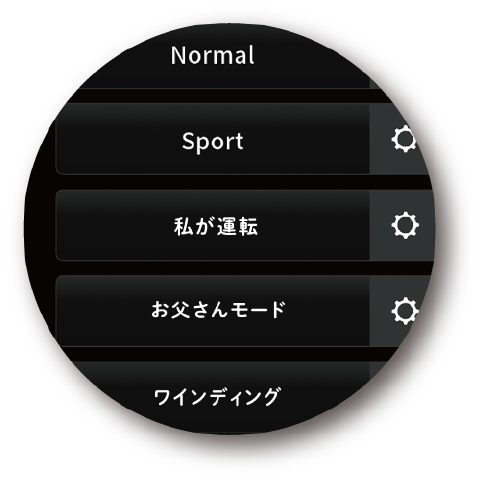 セットしたオリジナル設定を最大6つまで名前をつけて保存可能(カスタム設定保存)。走行シーン別に保存してもよし、家族内で車を共有している場合などは、ドライバーの名前を入力し、“走り”を使い分けることもできます。