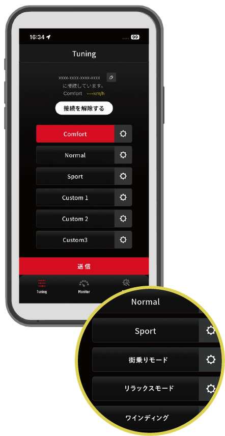 車のエンジンをかけてアプリを立ち上げた後、まず最初に<チューニング画面>で「接続する」をタップしてコントローラと接続。その日の走行シーンや気分に応じてデフォルトでプリセットされている「Comfort」「Normal」「Sport」あるいはご自身で事前に保存してある設定を選択。画面下部の「送信」をタップすると、減衰力情報がコントローラに送信されます。