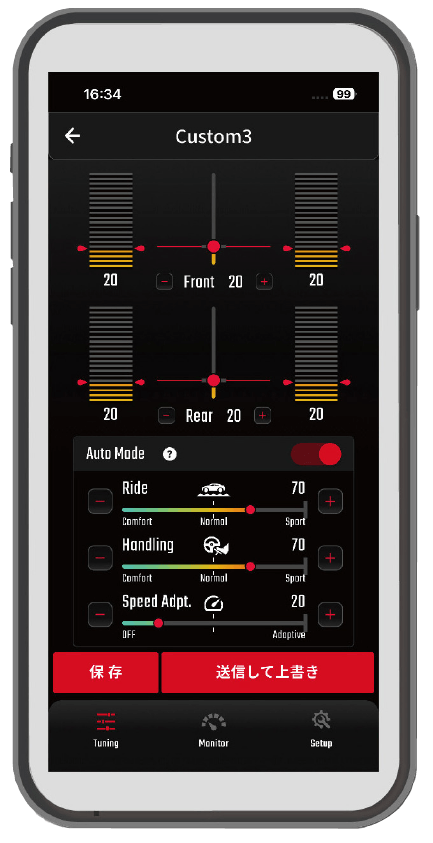 カスタム画面で個別にパラメータを設定することで、好みの乗り心地や操縦安定性に変更することができます。減衰指令を固定した状態で走行したい場合はオートモード(Auto Mode)を「オフ」にすることで、前輪・後輪それぞれベースダンピングを100段階(「0」が最も柔らかく、「100」が最も硬く)で調整することができます。