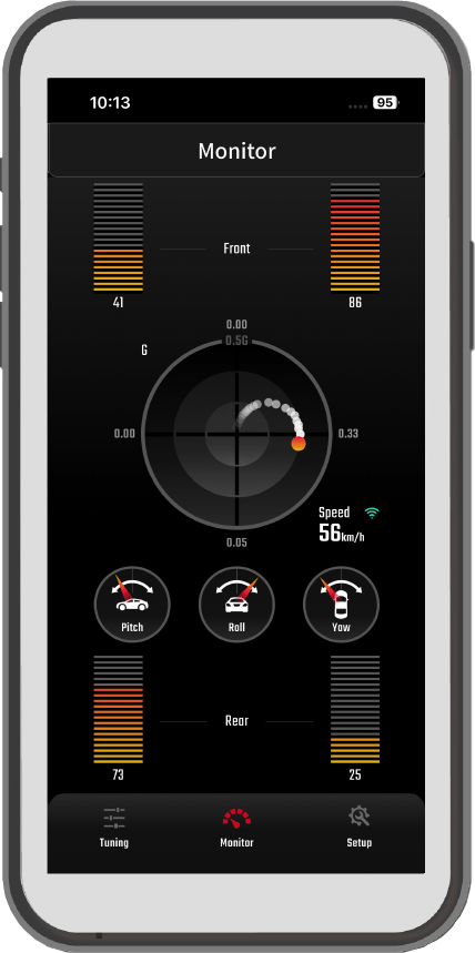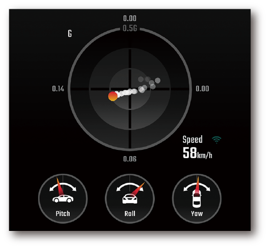 採用した6軸(車両の前後/左右/上下の3軸+ピッチ/ロール/ヨーの3軸)IMUセンサによって、車両の変化をリアルタイムに可視化。ハンドル操作や加減速時にGボールやジャイロメータなどが反応し、カスタマイズした車両挙動を把握できます。また、スマホの位置情報と連動させてモニタ上に車速も表示されます。
