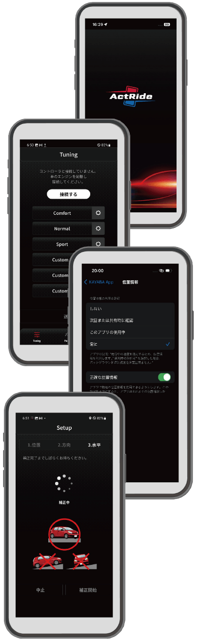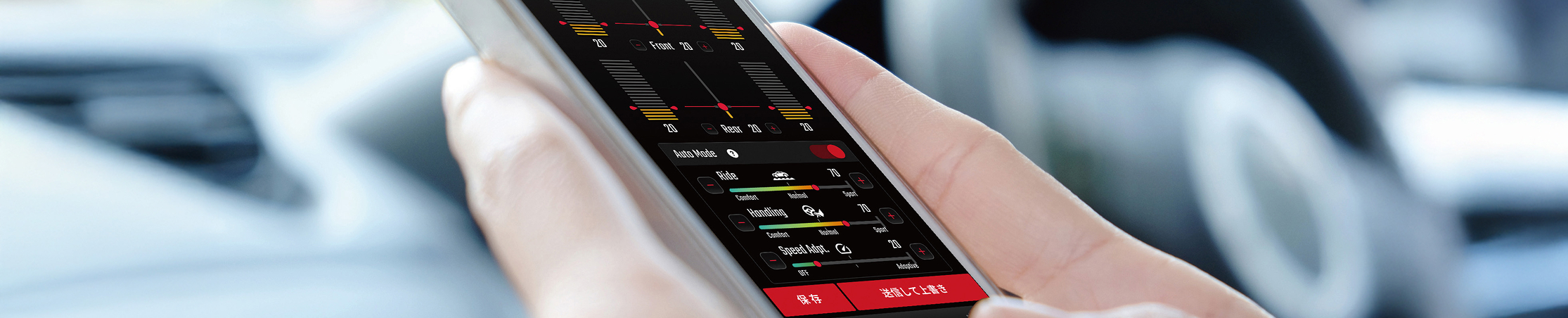 初期設定終了後も、操作は全てスマホ画面上で完結。設定選び(呼び出し)も、カスタマイズ設定も、車の挙動確認も、お手元のスマホで簡単に行えます。
